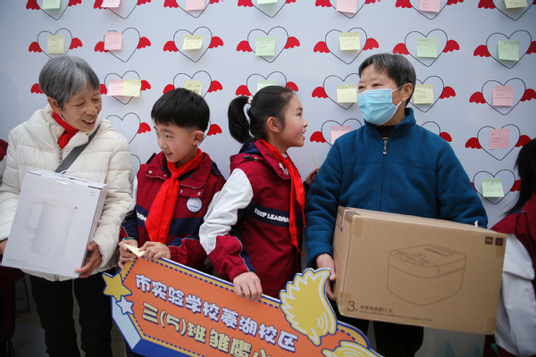 beat365唯一官网_365足球平台入口_365黑道老大免费观看第一季在线市实验学校菱湖校区三(5)班雏鹰小分队的杜婧怡和同学们参加合唱表演,看到心愿墙上一位奶奶写着想要电饭煲,便拿出自己的零花钱给奶奶买了一只电饭煲,现场交给了这位奶奶。
