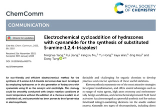 近日,我院杨明华教授与汤冬博士合作完成的学术论文——“Electrochemical cycloaddition of hydrazones with cyanamide for the synthesis of substituted 5-amine-1,2,4-triazoles”在国际期刊《Chemical Communications》上发表。该刊是英国皇家化学会出版的化学综合类权威期刊之一,JCR影响因子为6.065(SCI二区)。5-氨基-1,2,4-三氮唑及其衍生物是一类重要的药物中间体,广泛用于药物合成。传统方法是在化学催化、加热条件下,由腙与氨基乙腈或碳化二亚胺合成。近年来,电化学合成作为一种温和、环境友好的合成方法,已经成功应用于各种功能有机分子合成。本研究首次在室温下,用电化学方法催化芳腙(或芳醛与肼)与氨基乙腈反应,高效合成了5-氨基-1,2,4-三氮唑及其衍生物,该方法不需要加热、金属催化和氧化剂的参与,为该类化合物合成提供了一种友好、高效、原子经济性的方法。